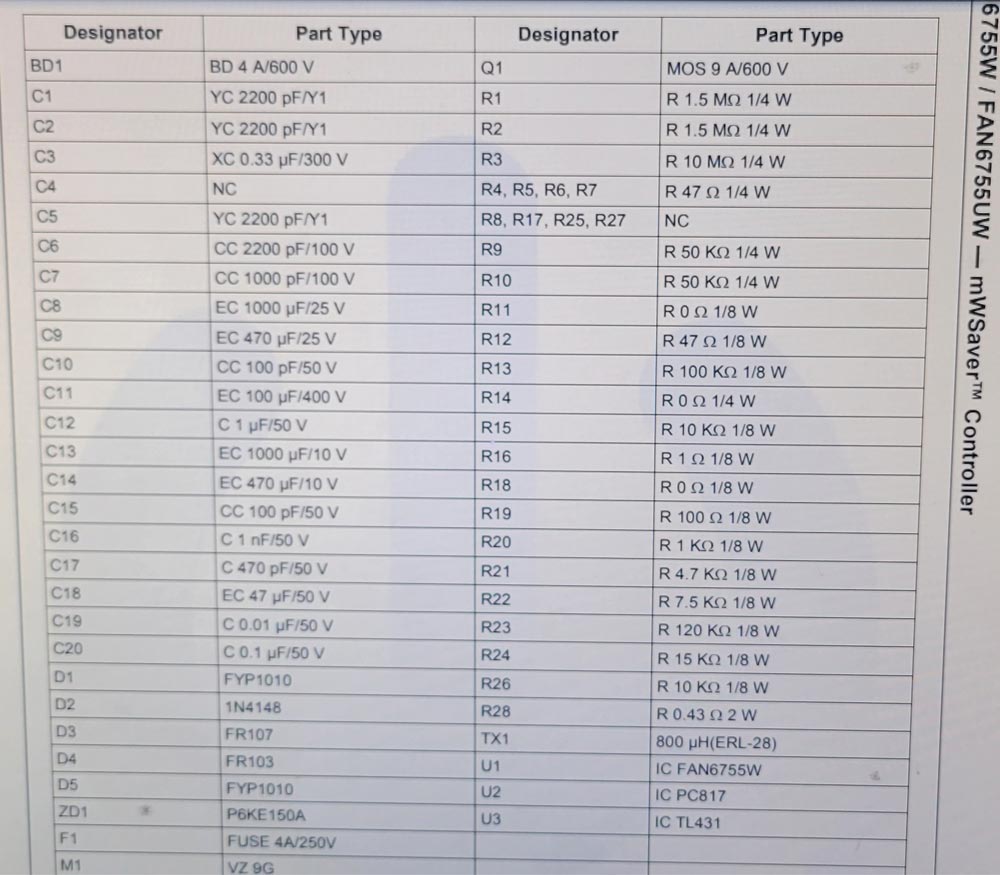 看来得另避蹊径了,既然烧掉的这几个电阻都是电源芯片FAN6755的外围电路,那或许找FAN6755的典型应用电路可以估测出这几个烧掉的电阻的阻值吧。网络上很快就搜索到了FAN6755的官方应用电路,对照着炸掉电阻留下来的残损数字,勉强判断出位号RS809电阻的阻值应该是22Ω、位号RS812电阻的阻值是10kΩ、位号RS813电阻的阻值是100Ω。找来几个型号相同的元件焊上去,希望不要再出意外了。单电源板插上220V电测量输出电压,5V待机电压出来了,给PS_ON 加上个开机电压,12V供电也有输出了。把电源板拿到用户家装上,电视机能正常开机了。