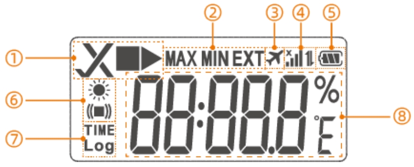 | ⑥光照、震动报警标志 ⑦时间、记录条数 ⑧温湿度值 |